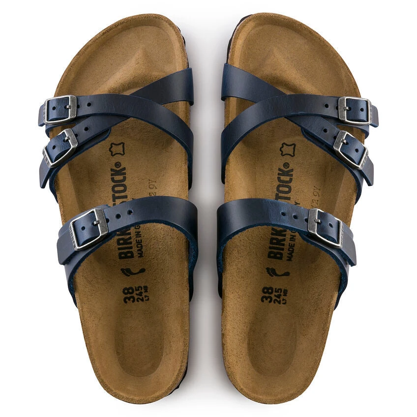 The BIRKENSTOCK Franca is an elegant model designed with slim, stylish crisscrossed straps. Featuring an impressive combination of design and wearability for all day comfort. The upper is made from extra thick, oiled nubuck leather.