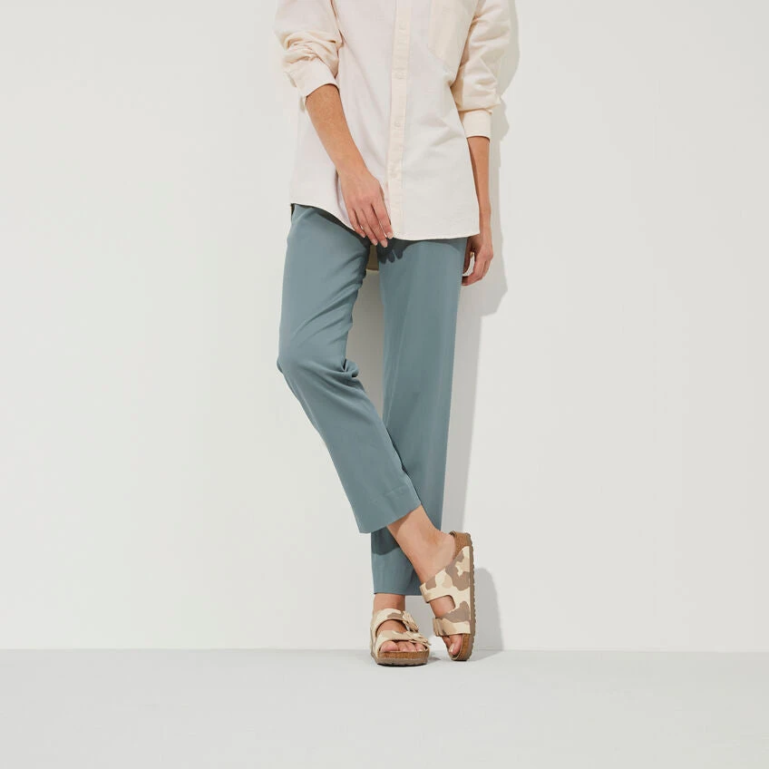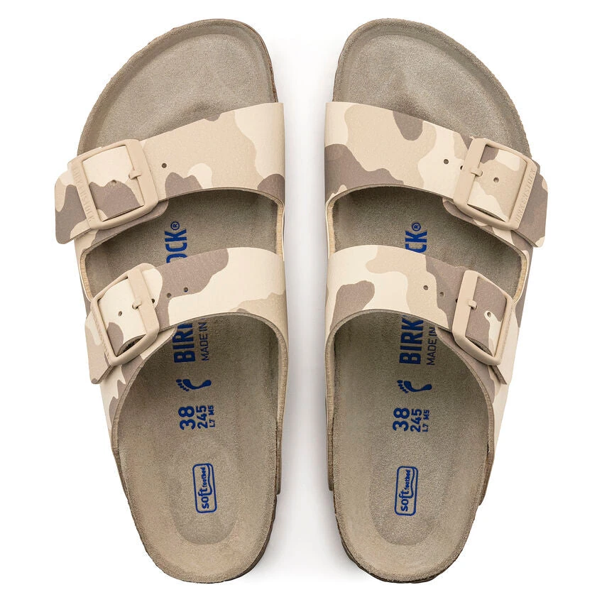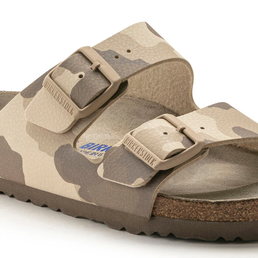 The legendary two-strap design from BIRKENSTOCK – the Arizona. Iconic style complemented with the signature comfort of the BIRKENSTOCK footbed. Featuring a muted camouflage print, as well as tonal buckles. With its additional foam layer, the soft footbed offers extra comfort – all day long. The upper is made from Birko-Flor®.