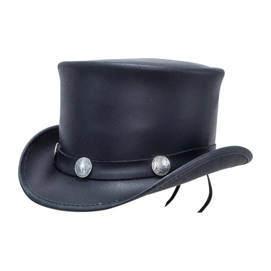 Our most modest Voodoo Hatter top hat. With a 4½” tall crown and simple Buffalo nickel style band, the El Dorado leather top hat can easily be dressed up or down. The luster of it’s full-grain, smooth leather is complemented by a shapeable wire brim for a personalized attitude adjustment.