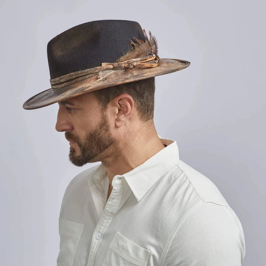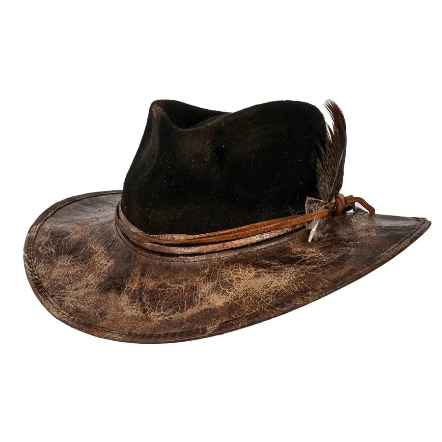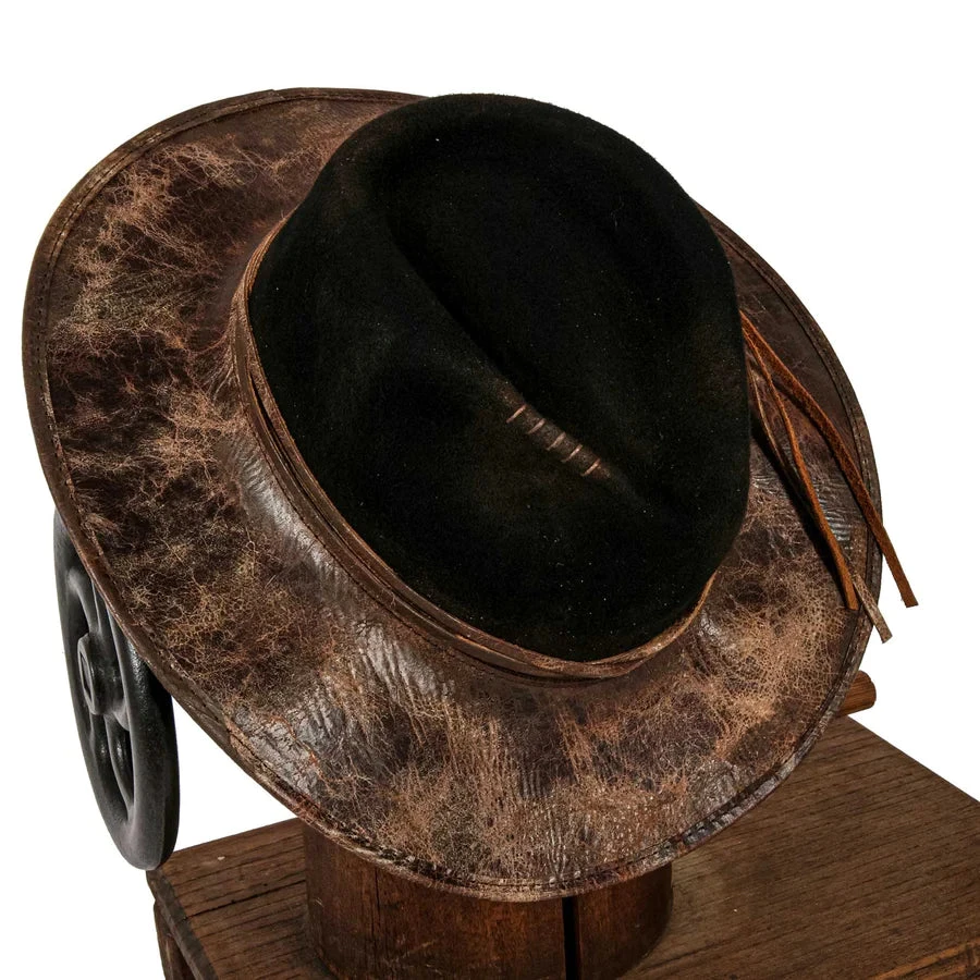 Strike gold with this rugged new style from American Hat Makers, the Prospector Felt Leather Fedora Hat. Each piece is distressed by hand for a totally unique look and feel. A vintage fossil leather brim combined with a durable wool felt crown makes this hat a stunner.