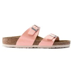 The BIRKENSTOCK Sydney has both form and function. With its two simple straps, it covers fashion and comfort. This version features silver-toned buckles and silky sheen finish. The upper is made from the skin-friendly, hard-wearing synthetic material Birko-Flor® with a silky sheen.