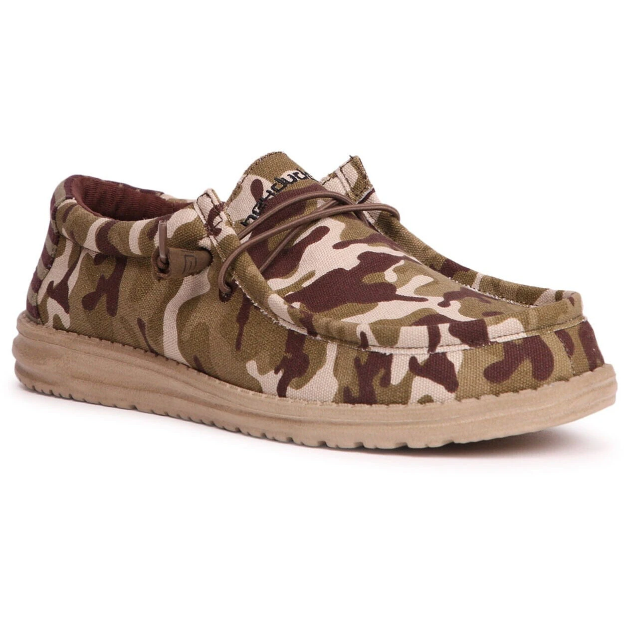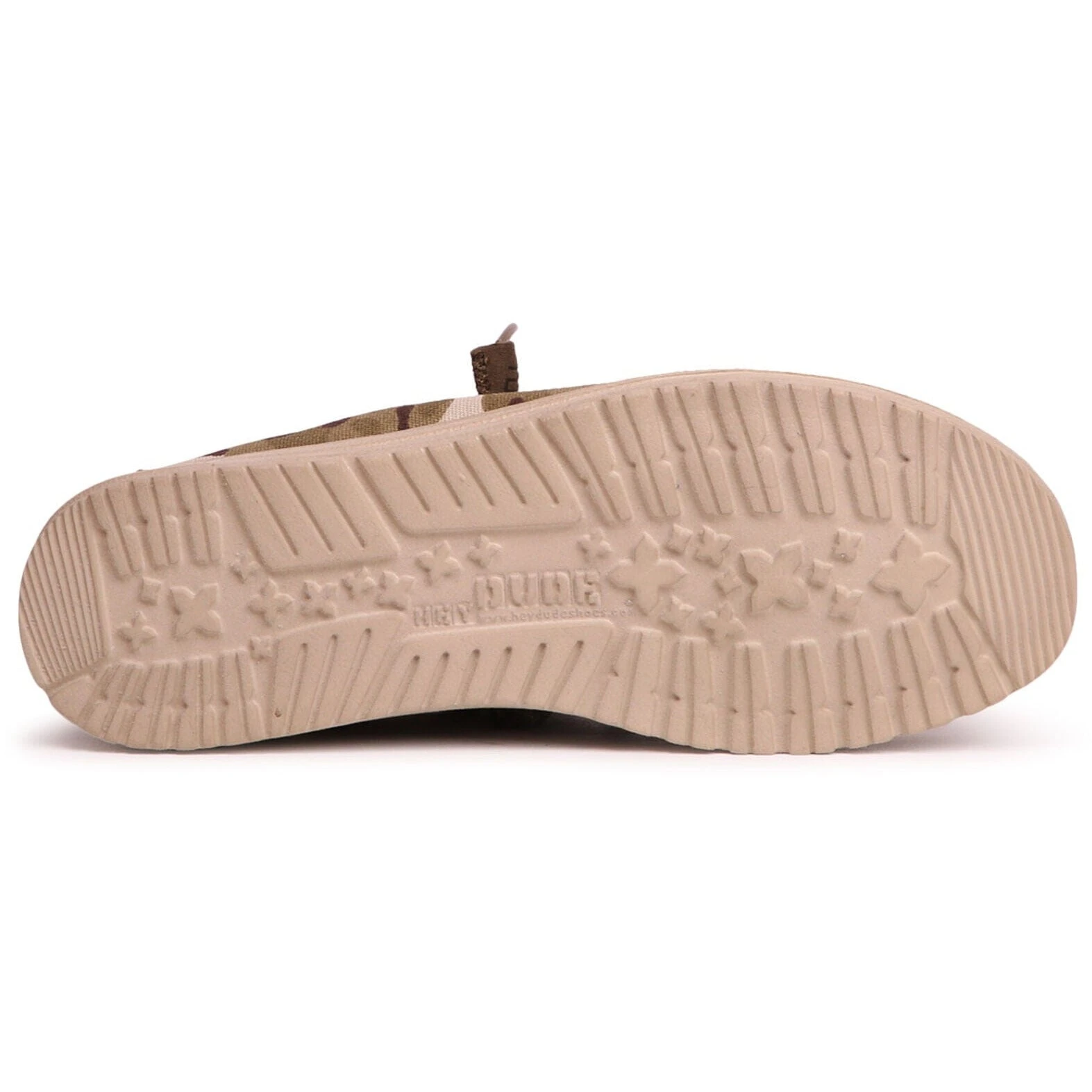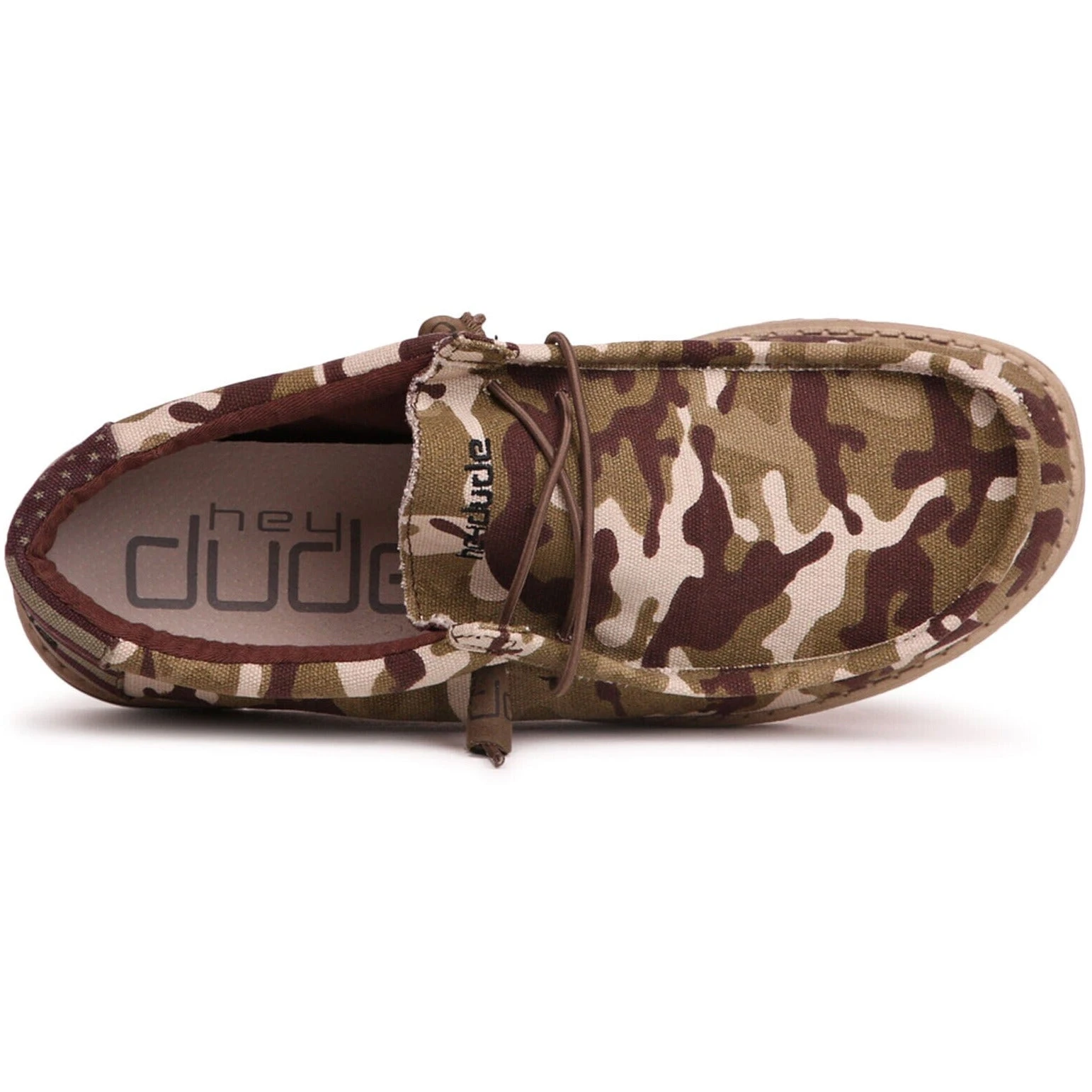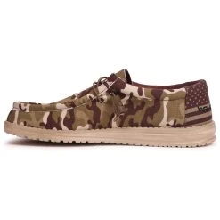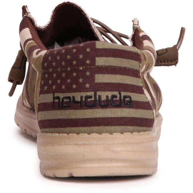 The Wally Camo Flag is a men’s casual shoe featuring Hey Dude’s signature Wally silhouette, updated with a stylish camo print and a bold American flag on the heel. It combines both modern style and comfort into one practical, stylish package.