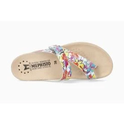 MEPHISTO HELEN | Women Cork Sandals Multicolor Leather Metallic Floral Print. This marvelously lightweight ladies’ toe post sandal, with its relaxed look, promotes a perfect sensation of well-being. The unique SOFT-AIR technology, integrated in the cork midsole, guarantees an effortless walk. The AIR-RELAX technology respects the anatomy of the foot to prevent fallen arches. Adjustable strap with buckle fastening.