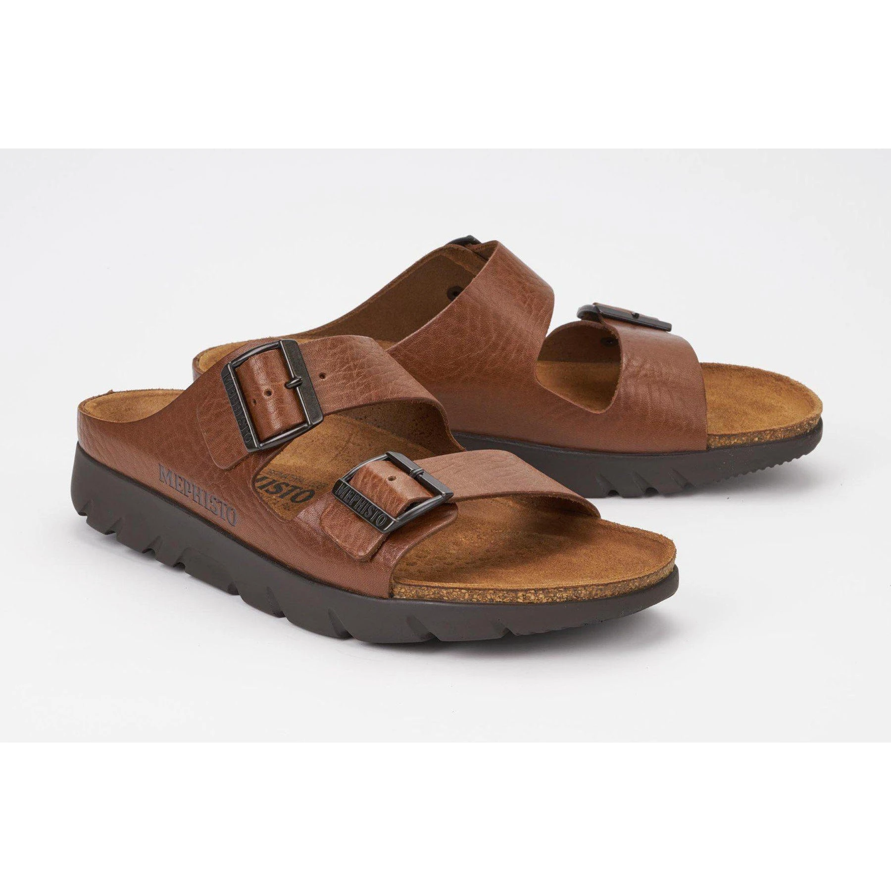 This Mephisto sandal is crafted of premium leathers for incredible comfort. Two adjustable leather straps, a leather insole, and a cork and latex midsole all work to comfortably cradle your foot. The thick rubber soles provide traction yet are incredibly lightweight. This shoe fits in best at a laid back summer barbecue, and remains comfortable while grilling, mingling, or playing lawn games.