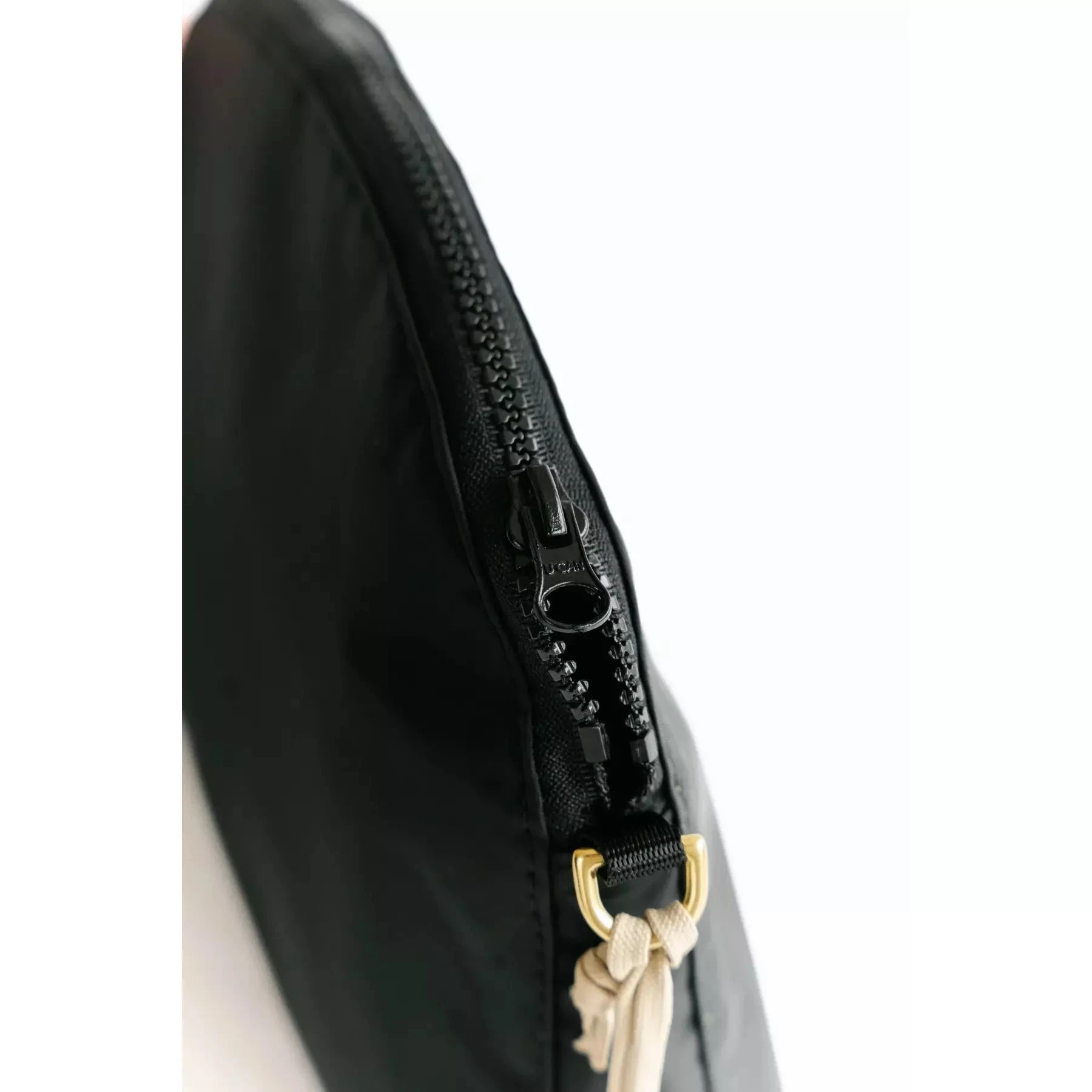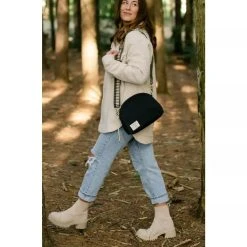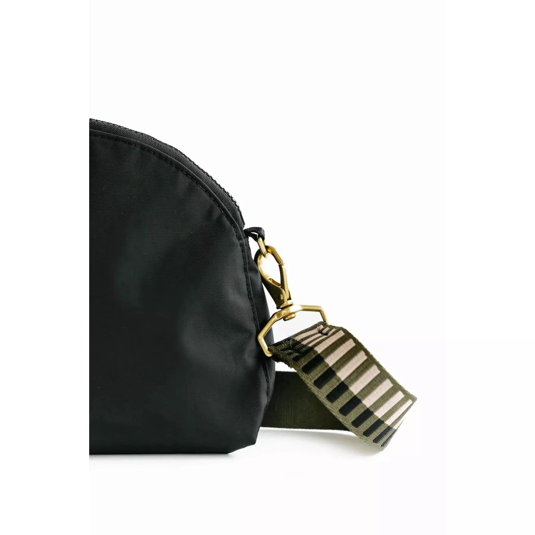 - Nylon webbed 1.5″ wide adjustable crossbody strap. Adjusts from 31″-54″ in length (measurement includes hardware).