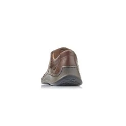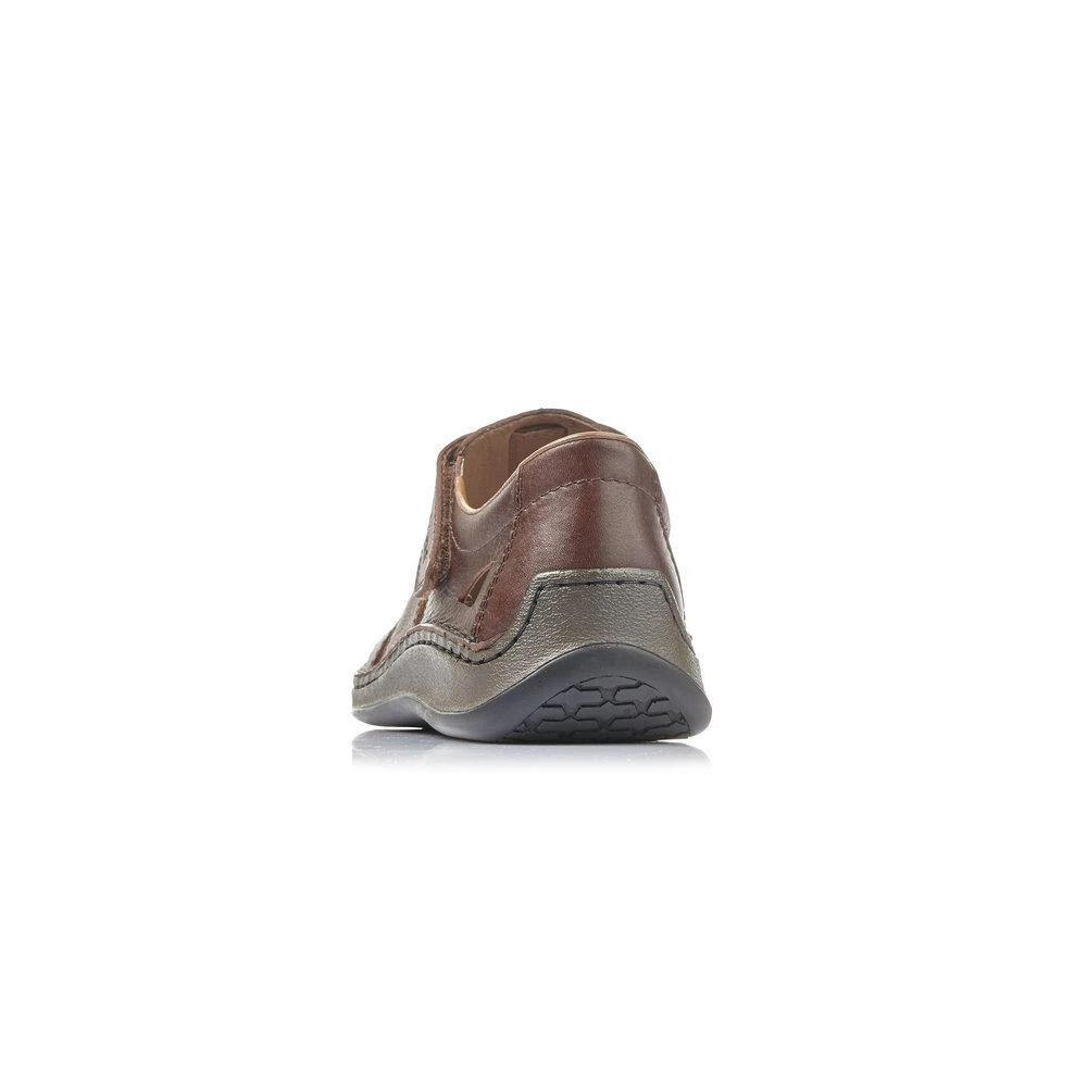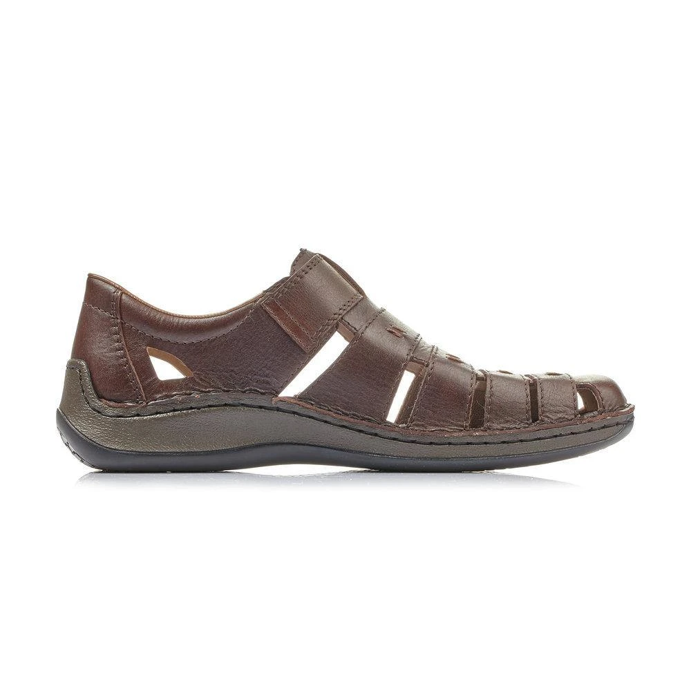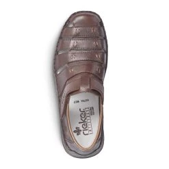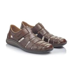The dark brown men’s Velcro shoe by Rieker offers its wearer safety thanks to the closed toe and back cap and a large portion of comfort. The shoe is ideal for summer because it not only has air-permeable cutouts, but also a breathable and moisture-absorbing insole made of genuine leather. The combination with the flexible Anti-stress outsole makes for perfect wearing pleasure. You can easily open the strap with the embossed Rieker lettering using the Velcro fastener and slip in. Your feet are then surrounded by a light lining made of imitation leather and the already mentioned leather cover sole. The upper material is also very high quality, as it is also made of genuine leather.