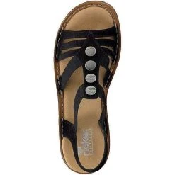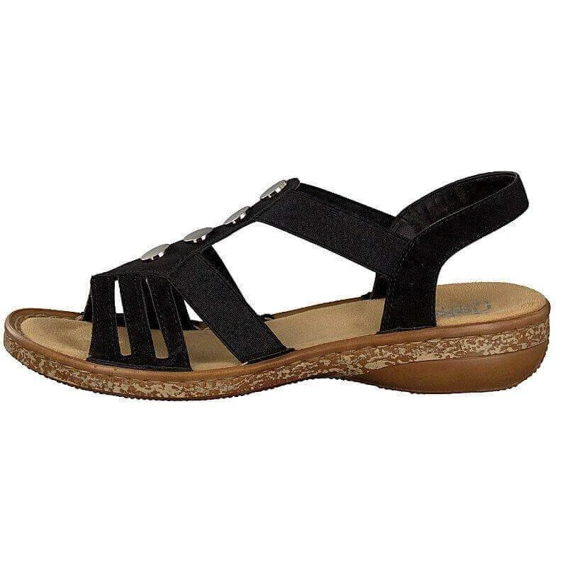You can start the day with refreshing ease every morning when you wear the new ladies sandal 62831 by Rieker. It accompanies you reliably with a soft insole made of skin-friendly synthetic and soft straps made of imitation leather. Four integrated elastic straps further enhance the comfort and good fit. The discreetly decorated middle strap with silver-colored embellishments gives this shoe that certain something.