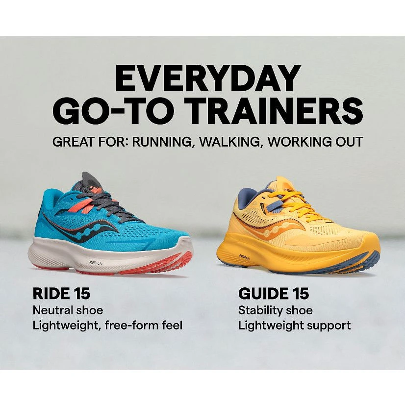 The redesigned Guide 15 delivers a comfort-first sensation that takes your run to new heights. Built using softer cushioning and a pillowy sockliner, it’s got more foam, less weight, and a guidance frame to help steer your stride.