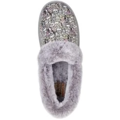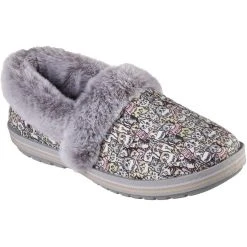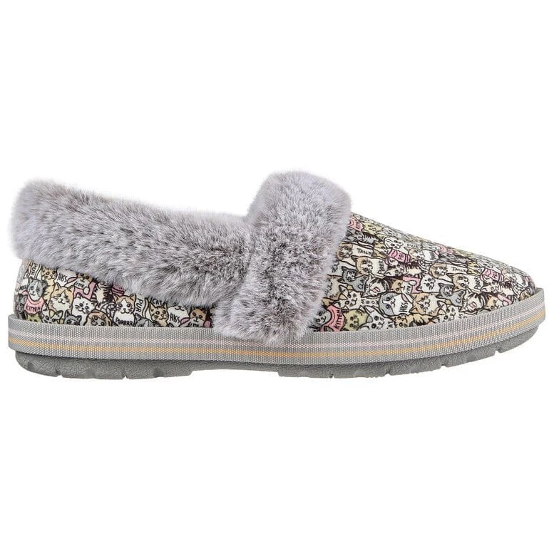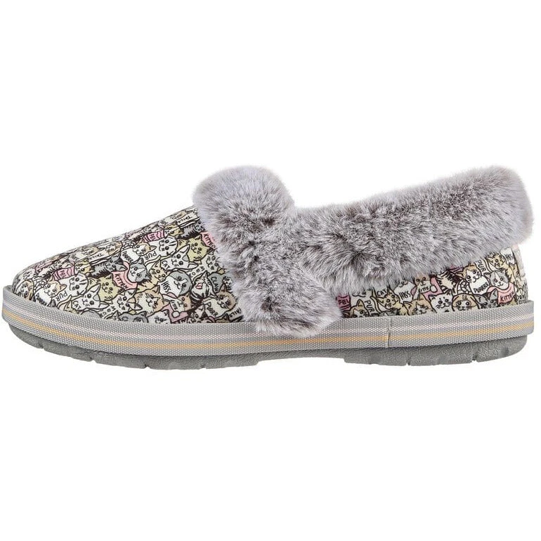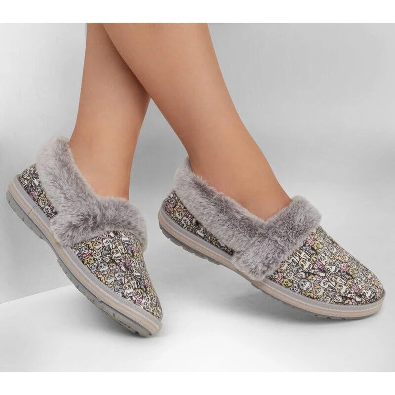 Cat-astrophic weather calls for warm comfortable style in BOBS from Skechersâ„¢ Too Cozy -Purrfect Storm. This casual slipper features a soft microfiber suede-textured upper with an allover ‘Purr Party’ cat print, faux-fur trim and a cushioned Skechers Memory Foamâ„¢ footbed. For every BOBS purchase, a donation is made to animals in need.