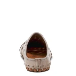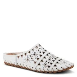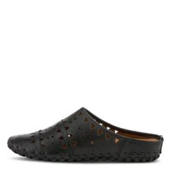 European influenced, leather open back slip-on shoe, featuring geometric laser cutouts and etching for a unique modern appeal all on a lightweight, durable, flexible, rubber sole for all day comfort.