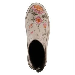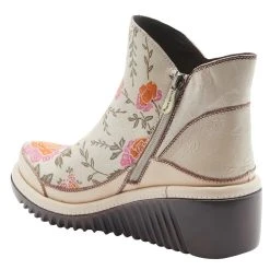 Genuine leather boot featuring hand-painted and embossed floral designs and back zipper on a lightweight wedge.