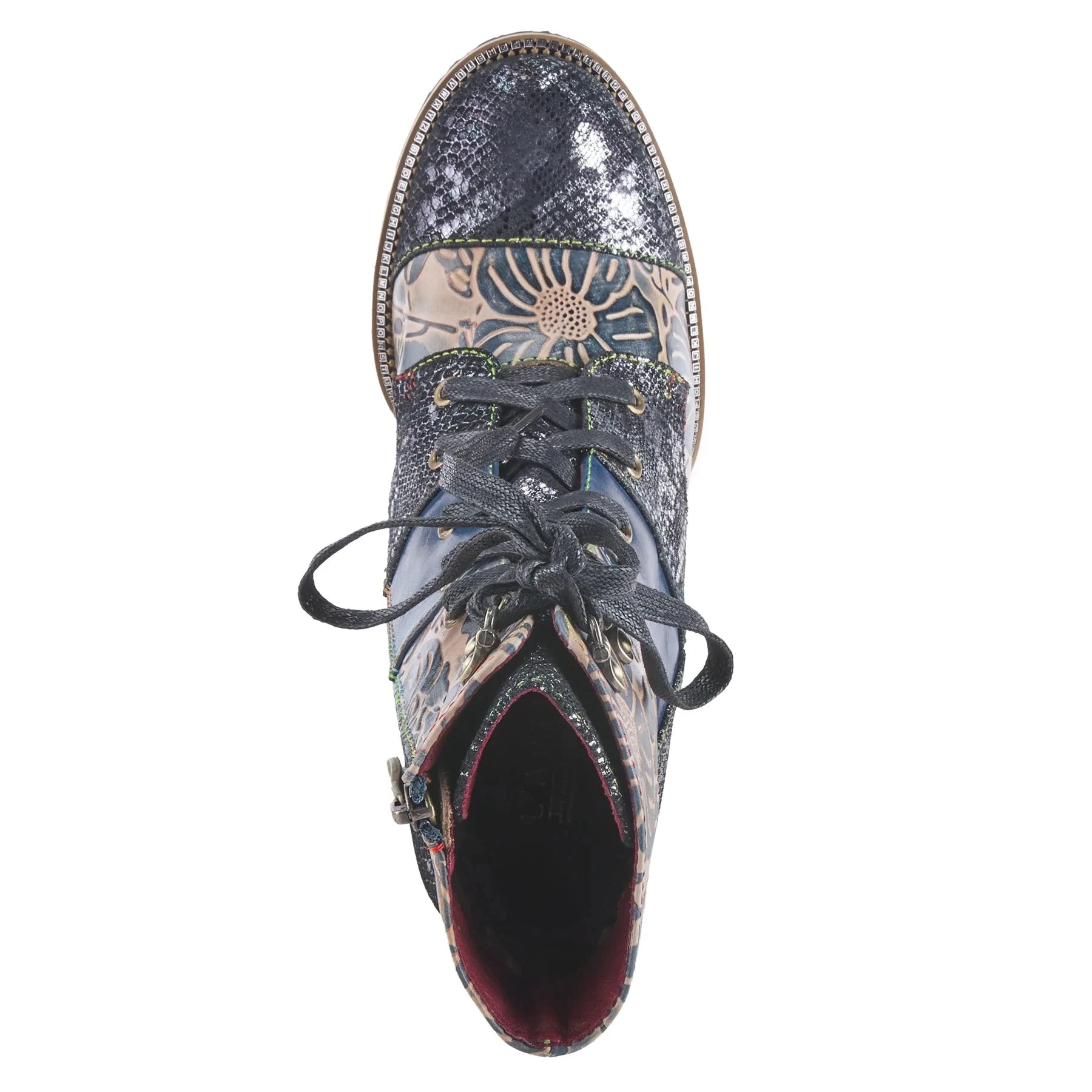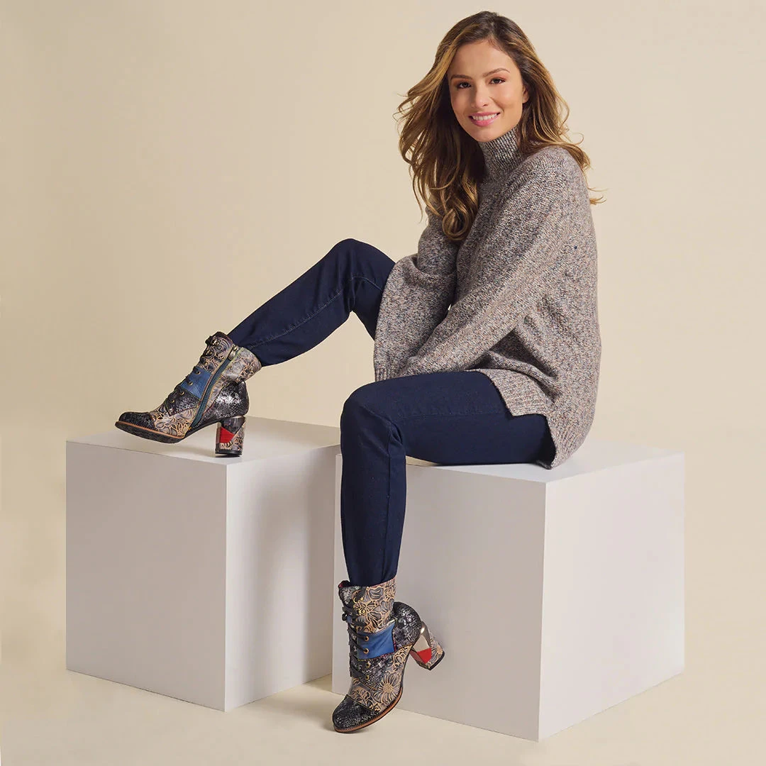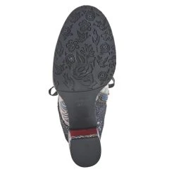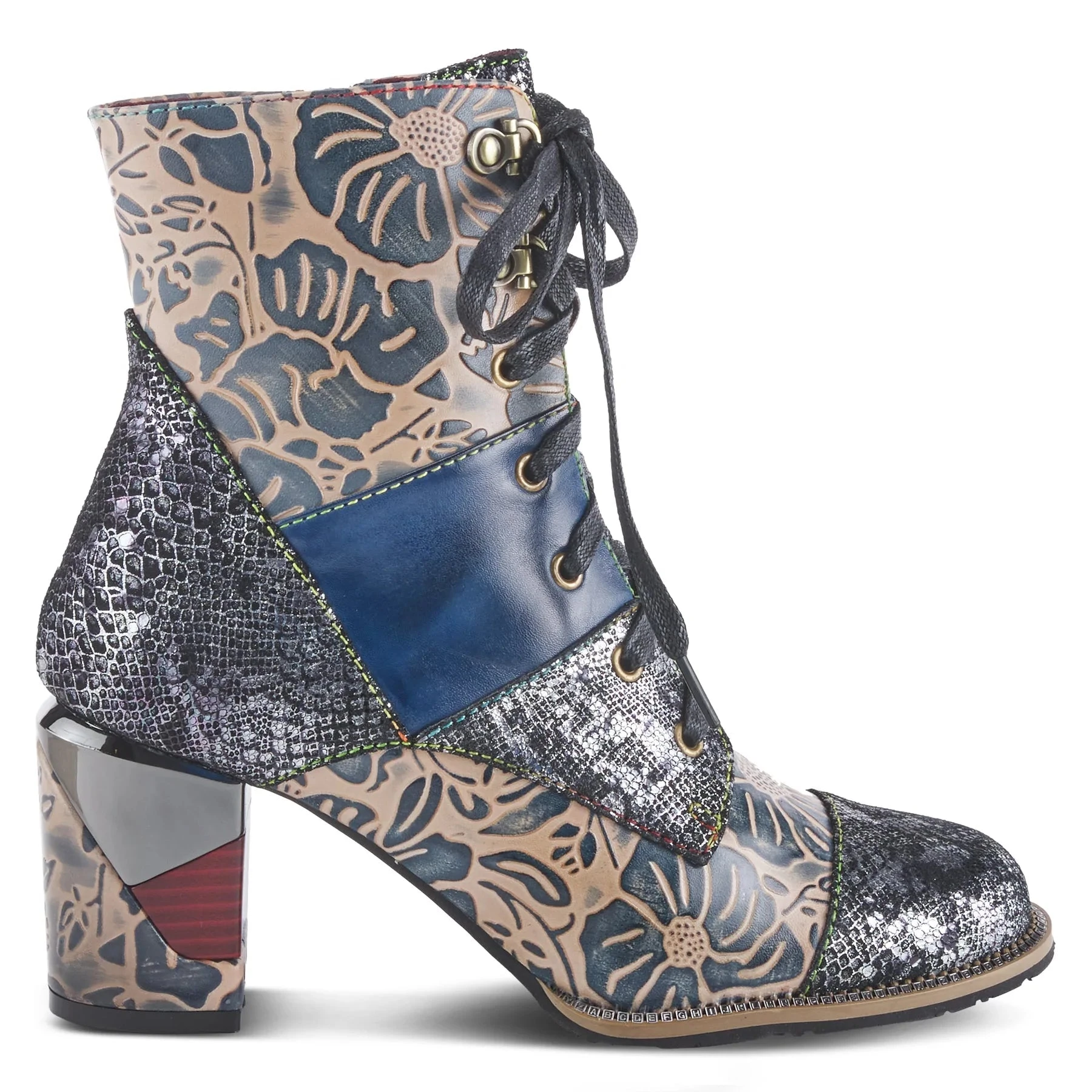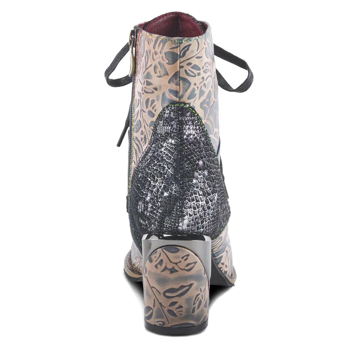 Unique genuine leathers combination design bootie with fancy heel and imprinted letters on the welt.