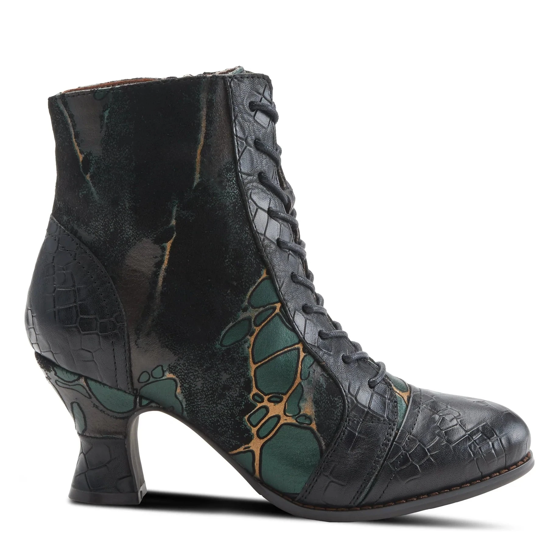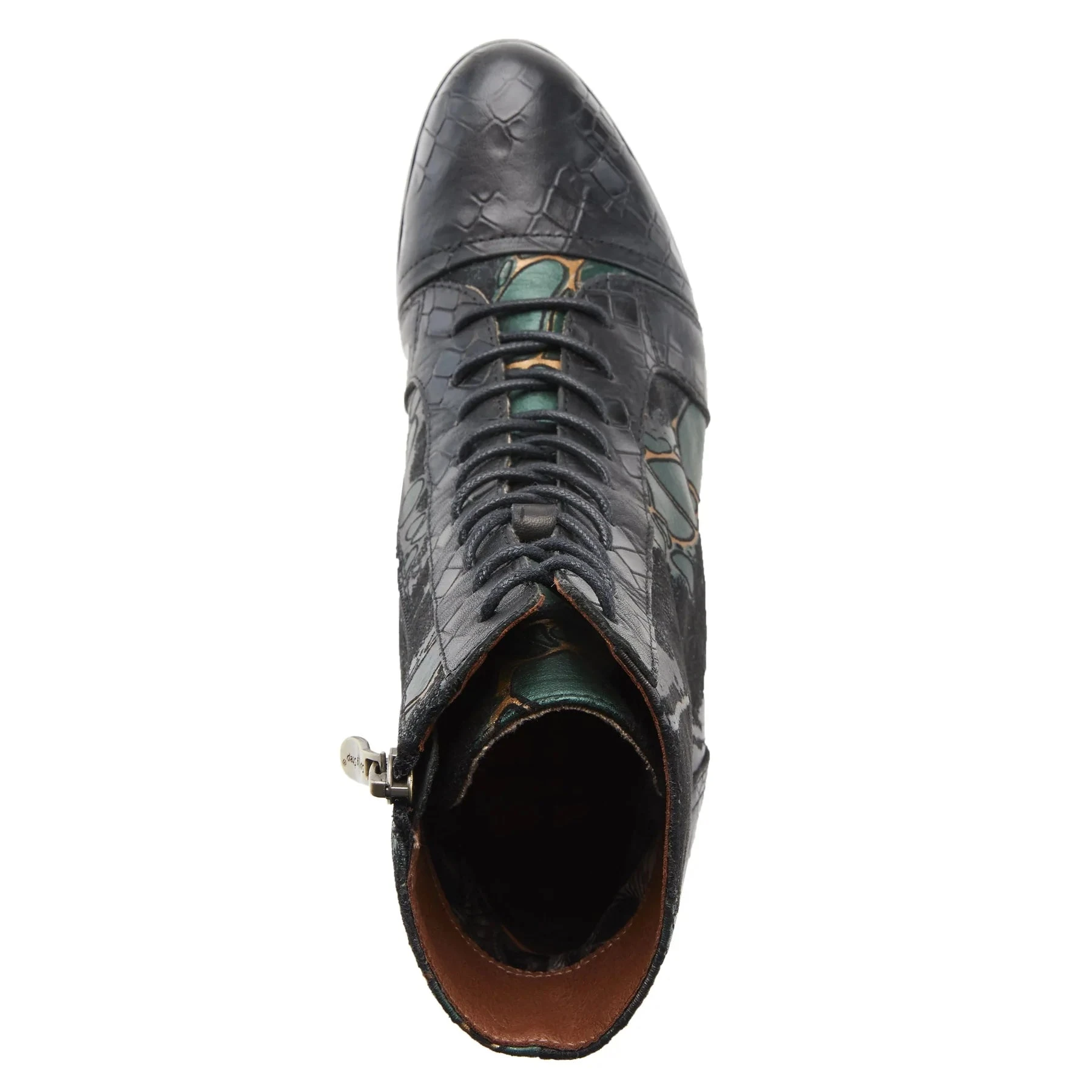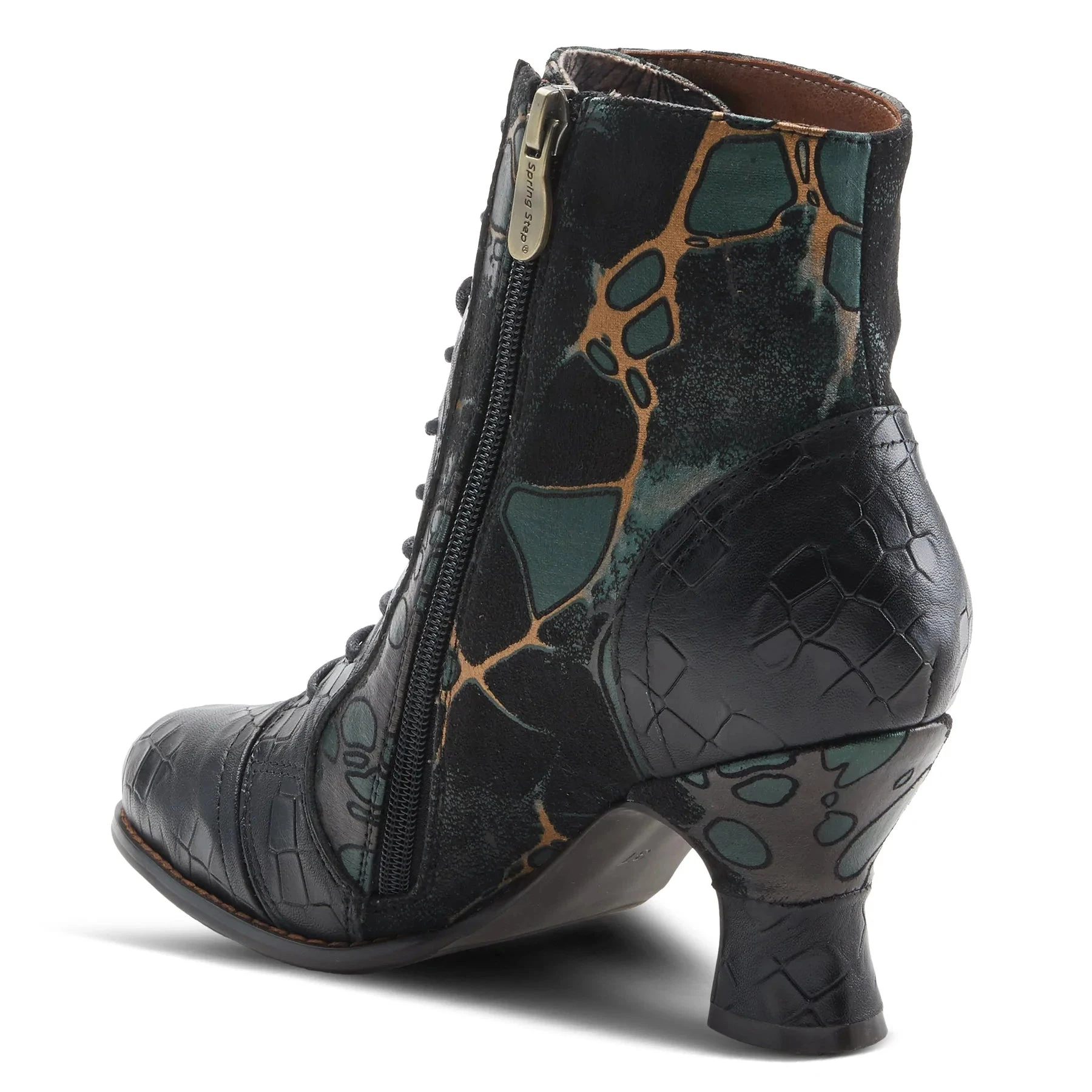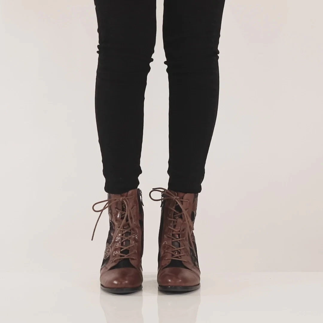 Dainty French-inspired embossed genuine leather and printed microfiber upper with laces and zipper closure for easy access and custom fit on a wrapped, kitten heel.