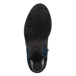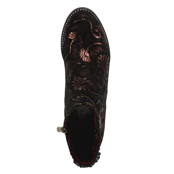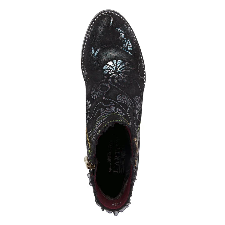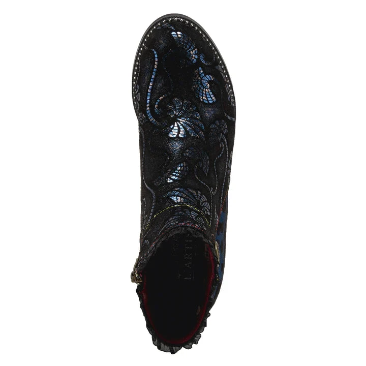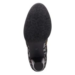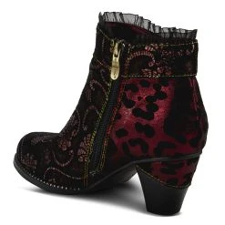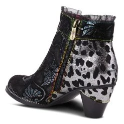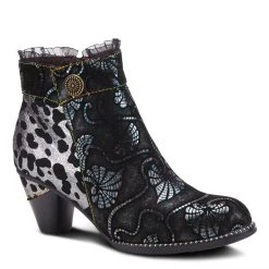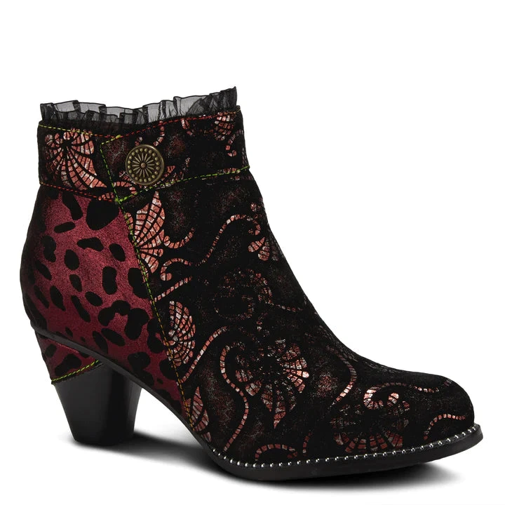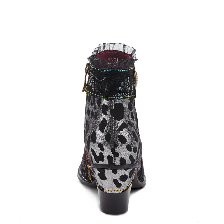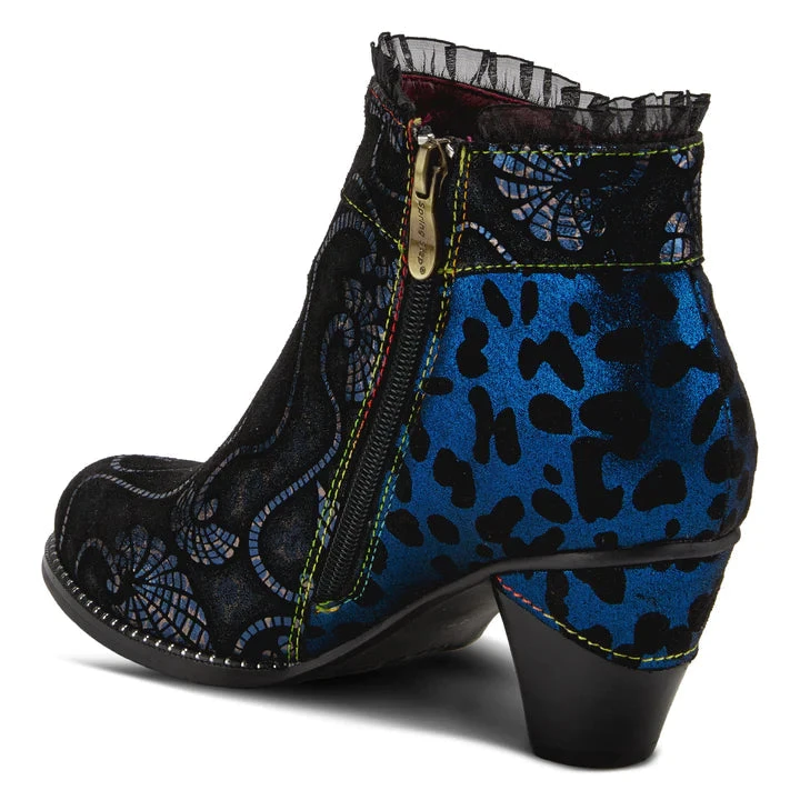 Step out in style and comfort in the perfect bootie for all day and into the night pleasure. Contrasting metallic printed suede kaleidoscope swirls meet colored animal print textile. Taffeta ruffle edged collar, studded welt sole and an inlay animal print stacked cone heel add to the allure. With her softly padded footbed and inside easy on off zipper, Dessa will surely become your favorite go-to style all season long.