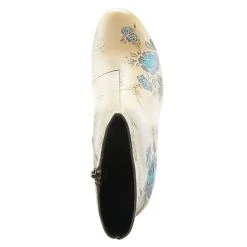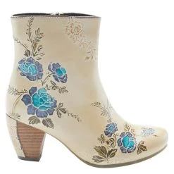 Premium genuine leather boots with embossed multi color floral details, an inside zipper for easy on and off on a stacked curvy heel with leather piece on the back.