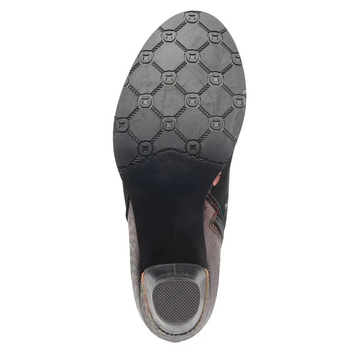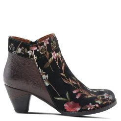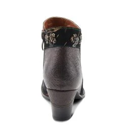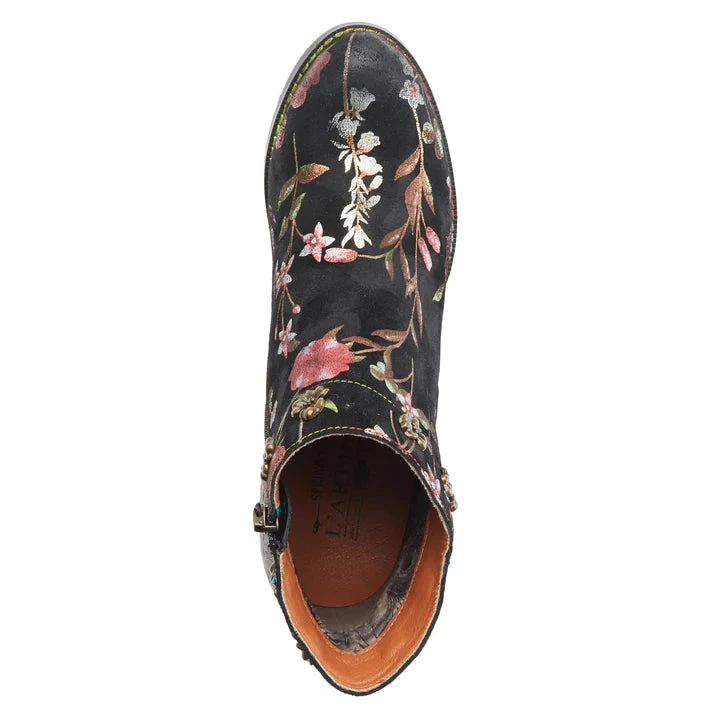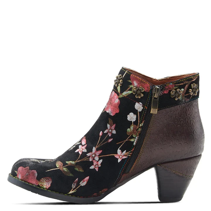 Gorgeous, printed suede and embossed leather bootie decorated with antique flowers on the shaft.
