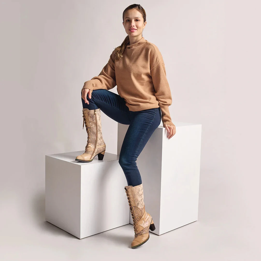 Hand-painted leather lace-up boot beautifully patterned with printed metallic floral textile.