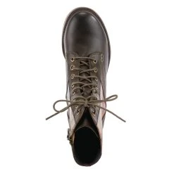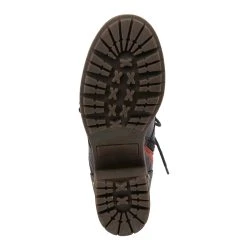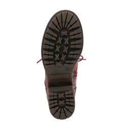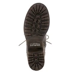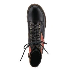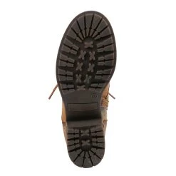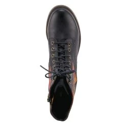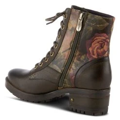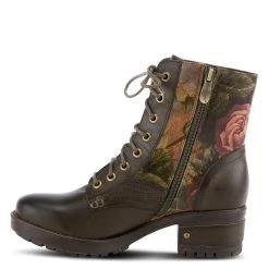 Feminine and floral combat-style leather boot featuring floral printed textile inset, functional lace-up design with eight (8) brushed metal eyelets, and tonal stitch work.