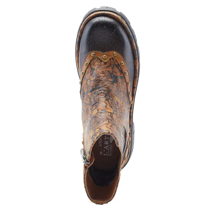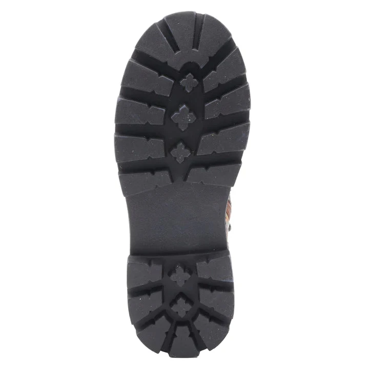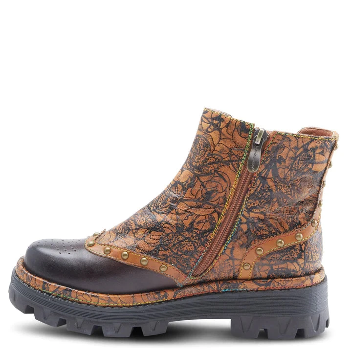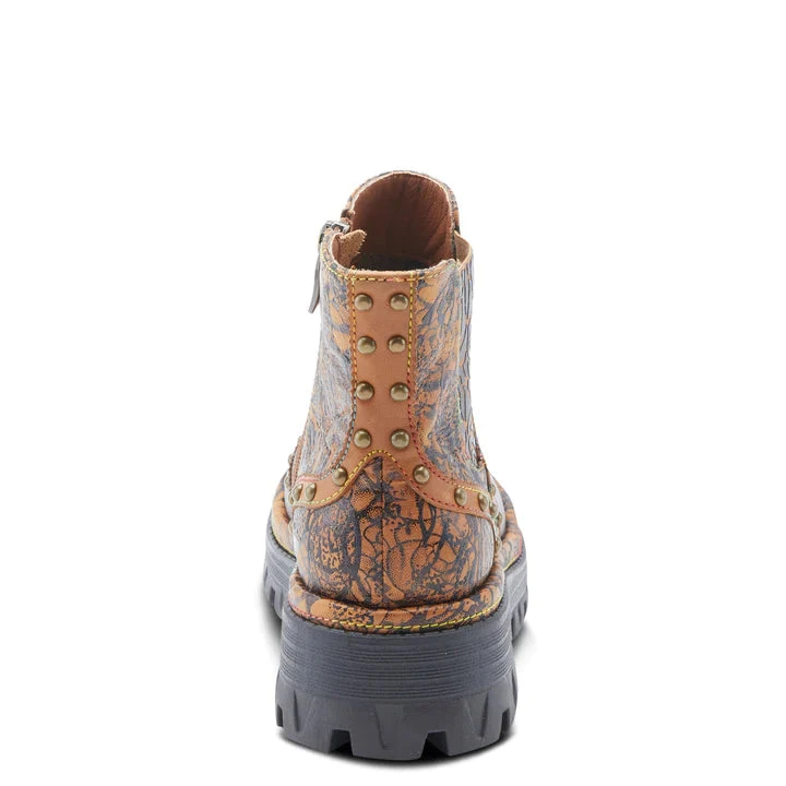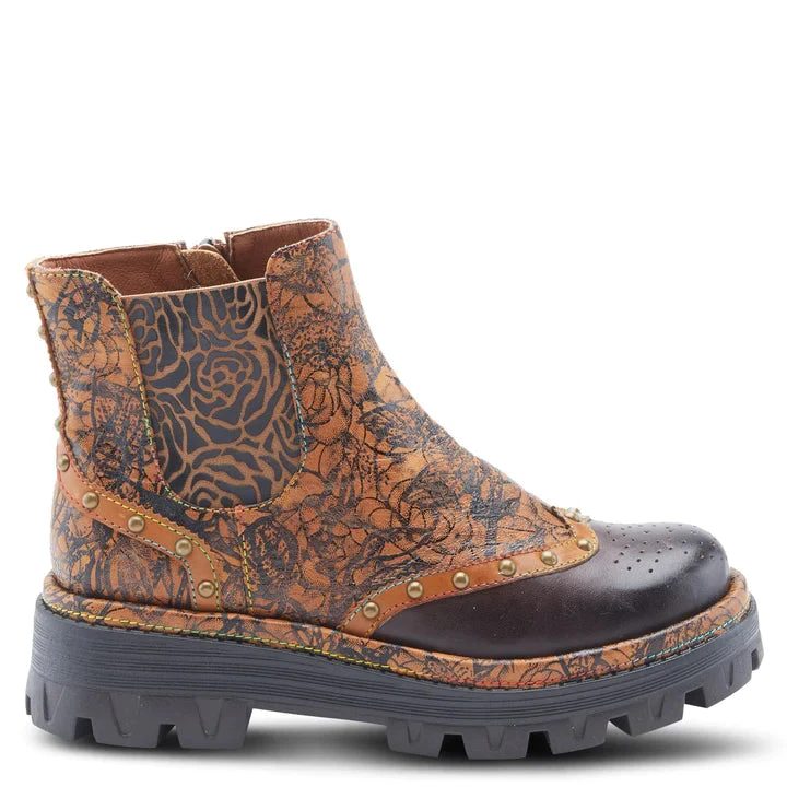 Trendy Chelsea boot with brogue detail, crushed floral design and printed stretch side gores on a lug heel with a platform.