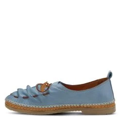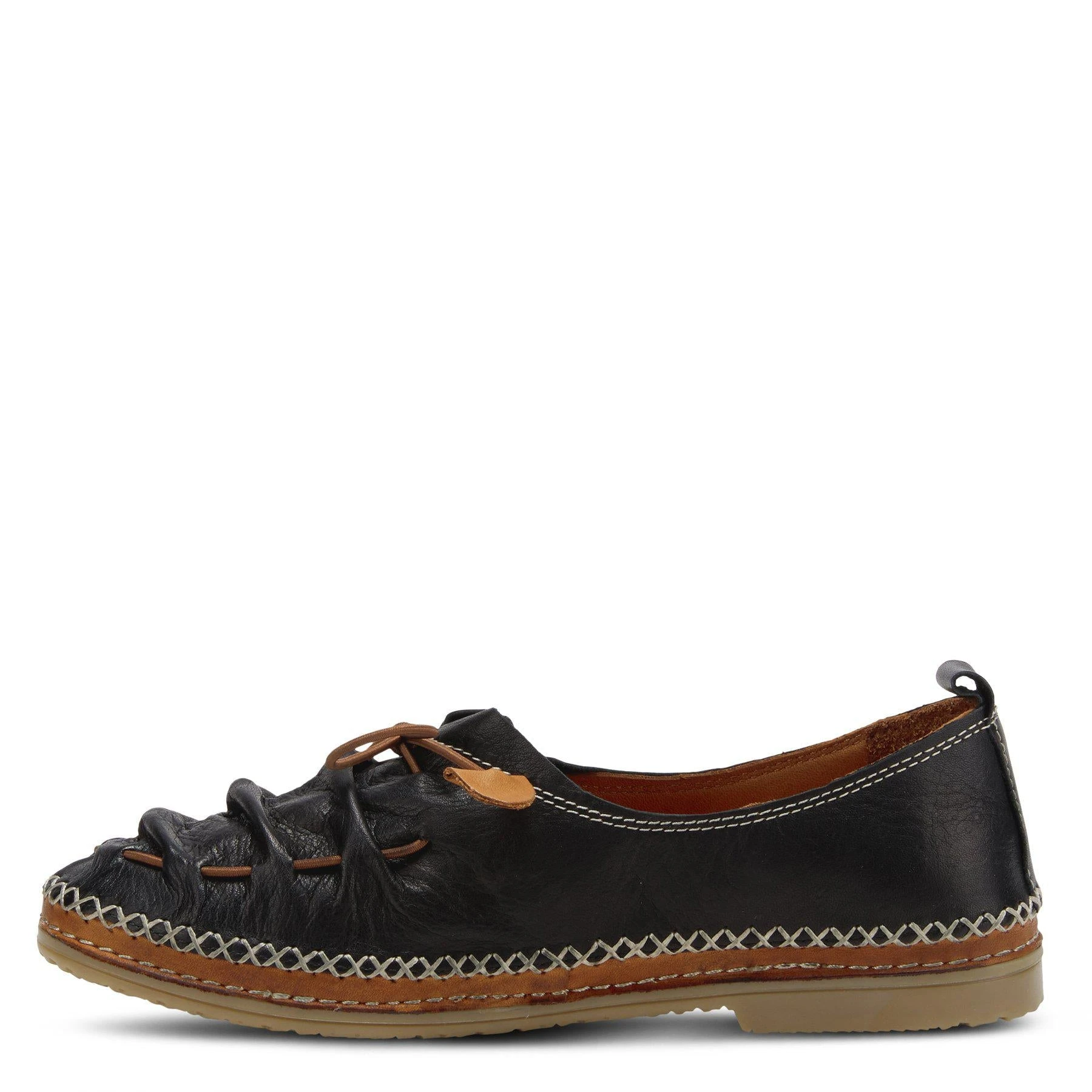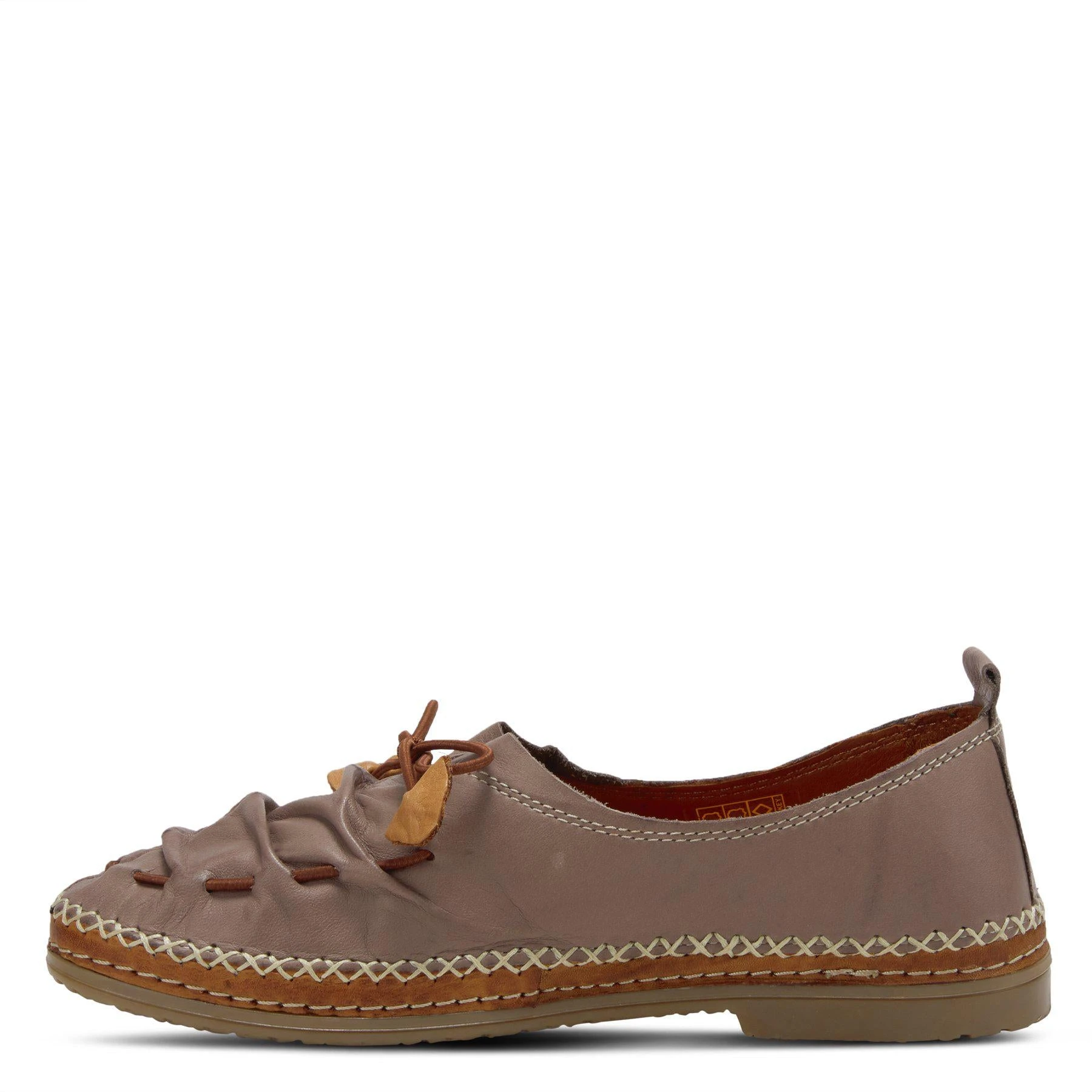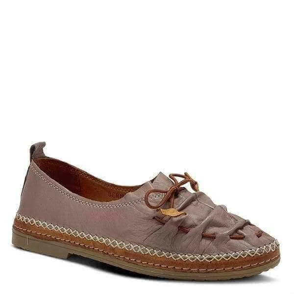 Trendy artistic slip-on shoe featuring an incorporated elastic vamp-tie and contrast whip-stitching.
