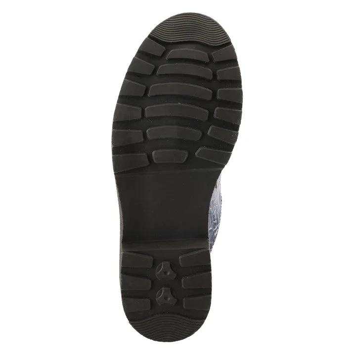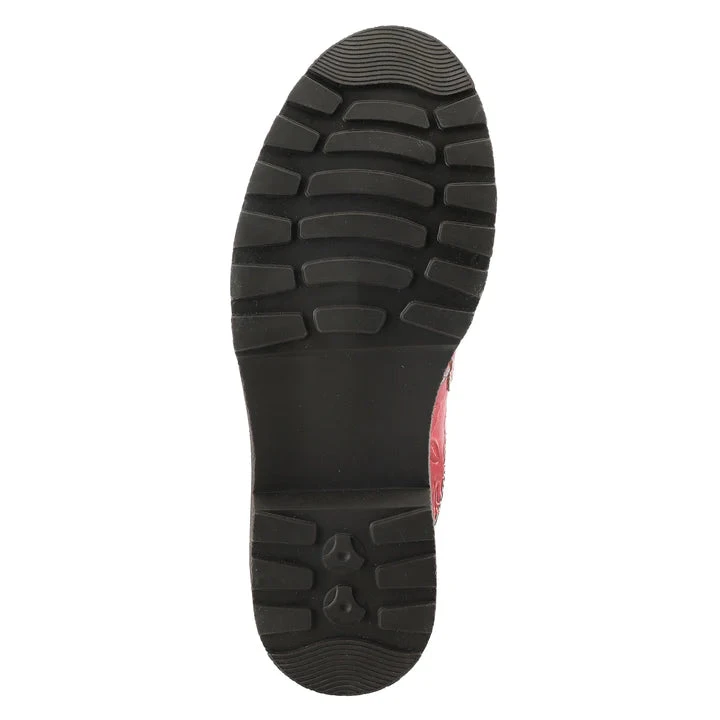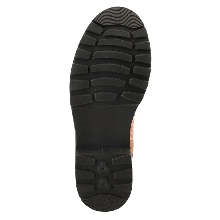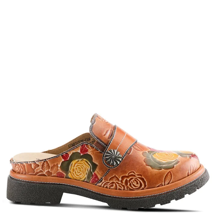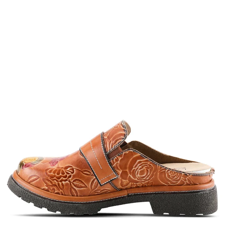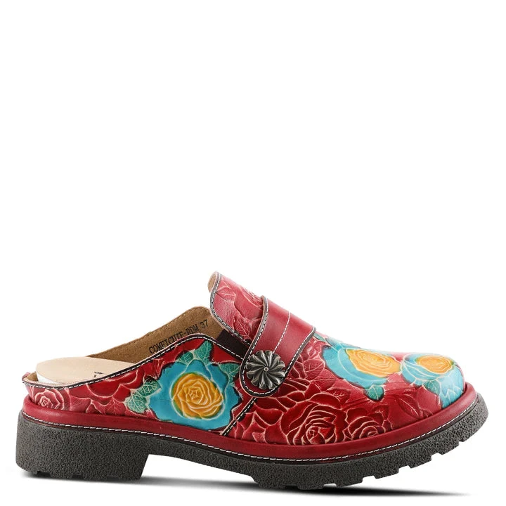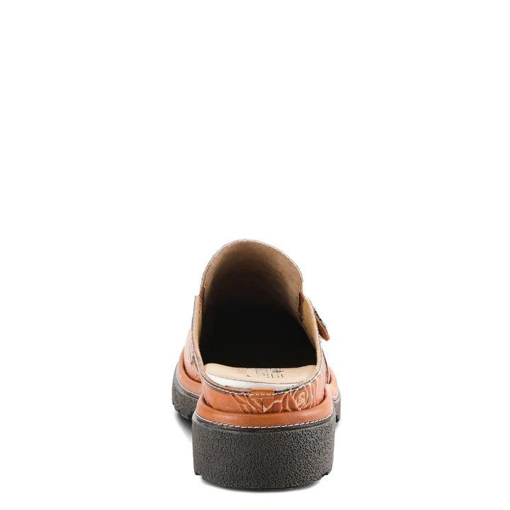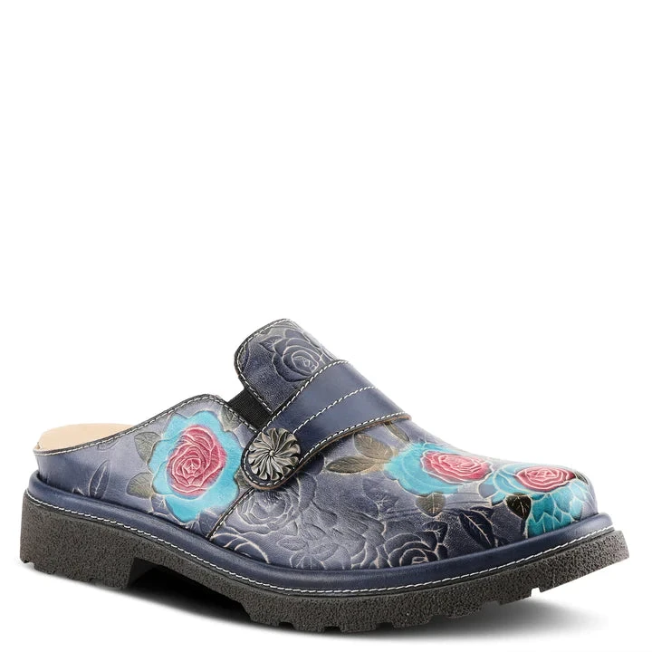 Slip-on backless shoe with stunning color pops in beautiful flowers, embossed leather, and oversized antique stud on a lug sole.