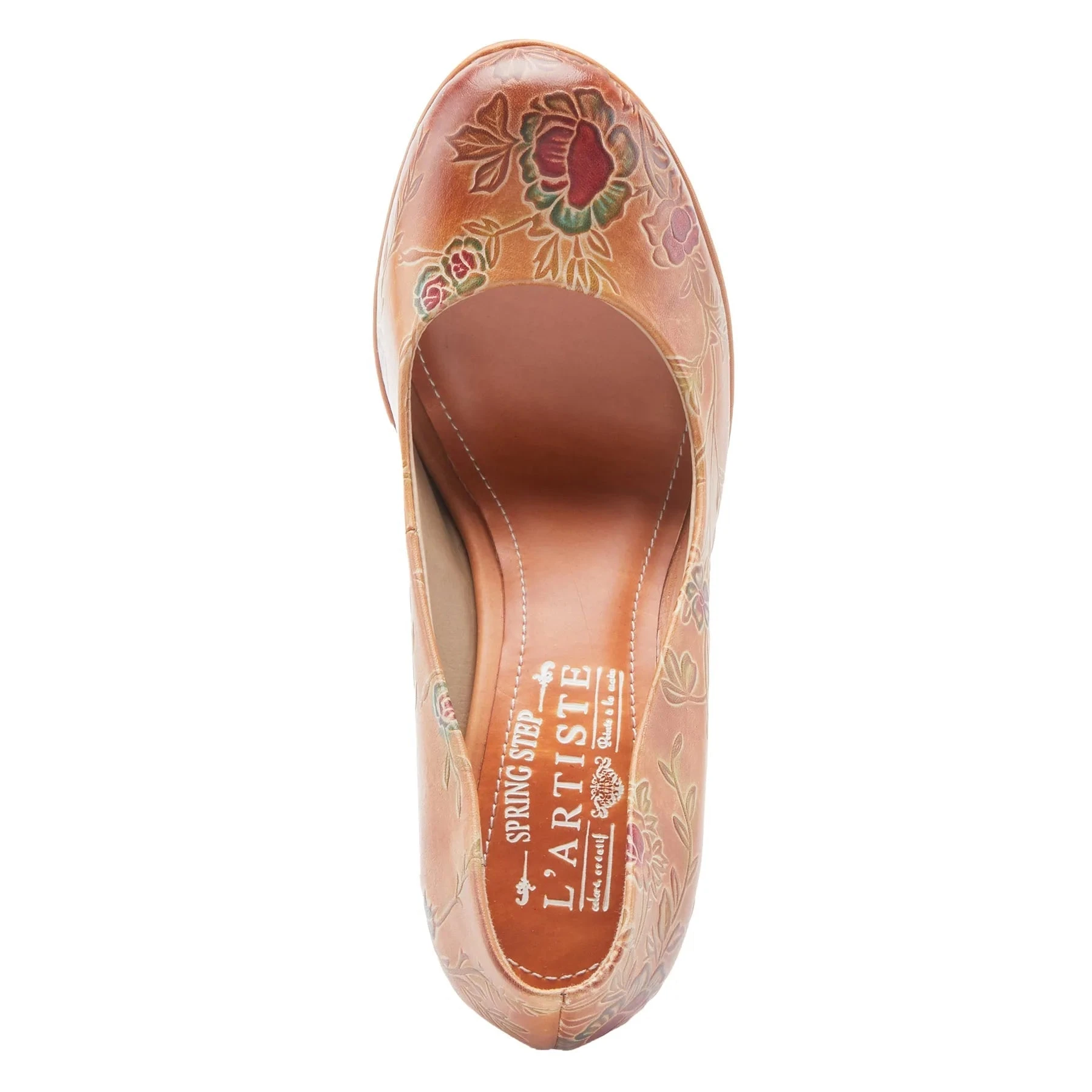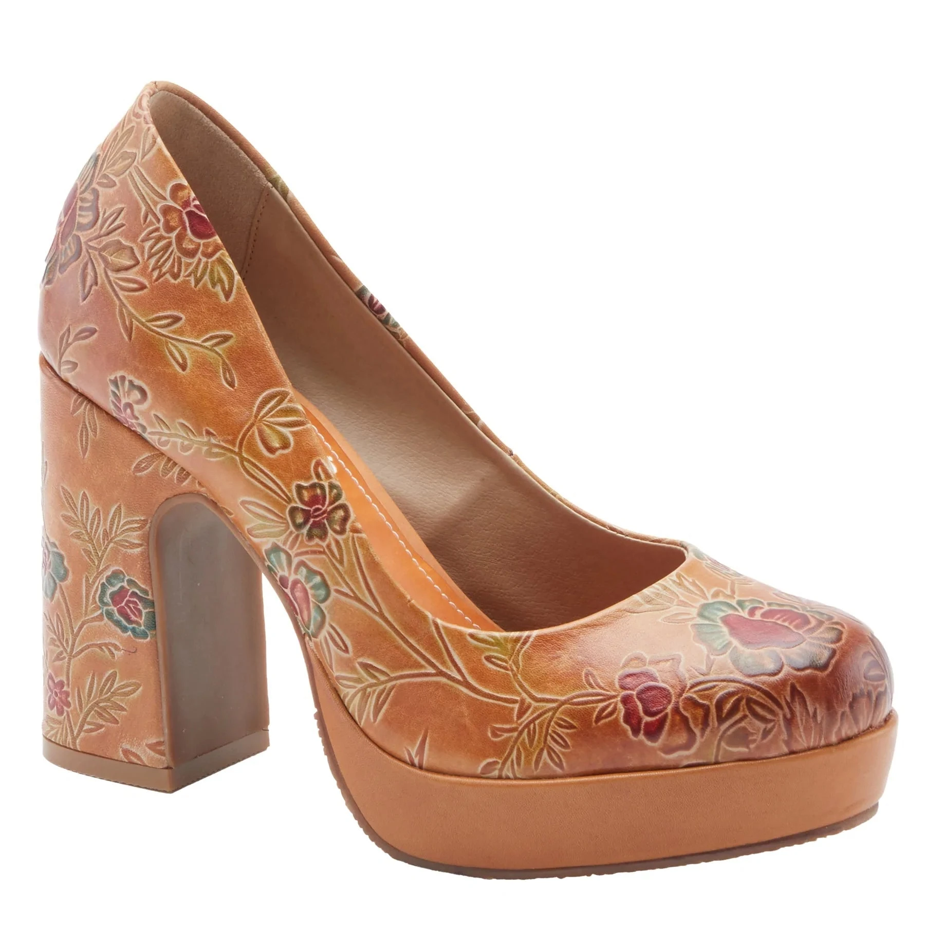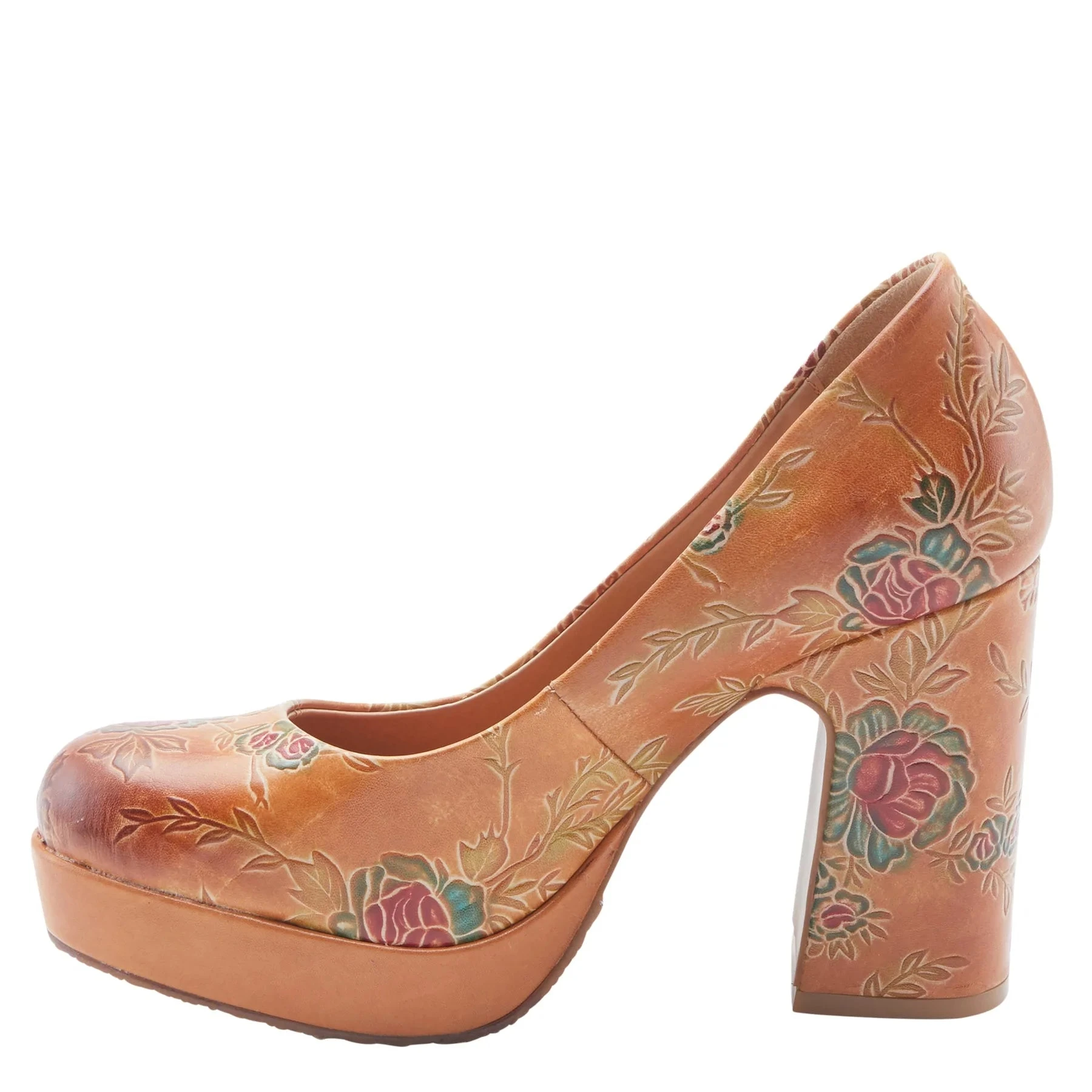 Trendy high heel genuine leather pump with a platform and a hand-painted floral design.