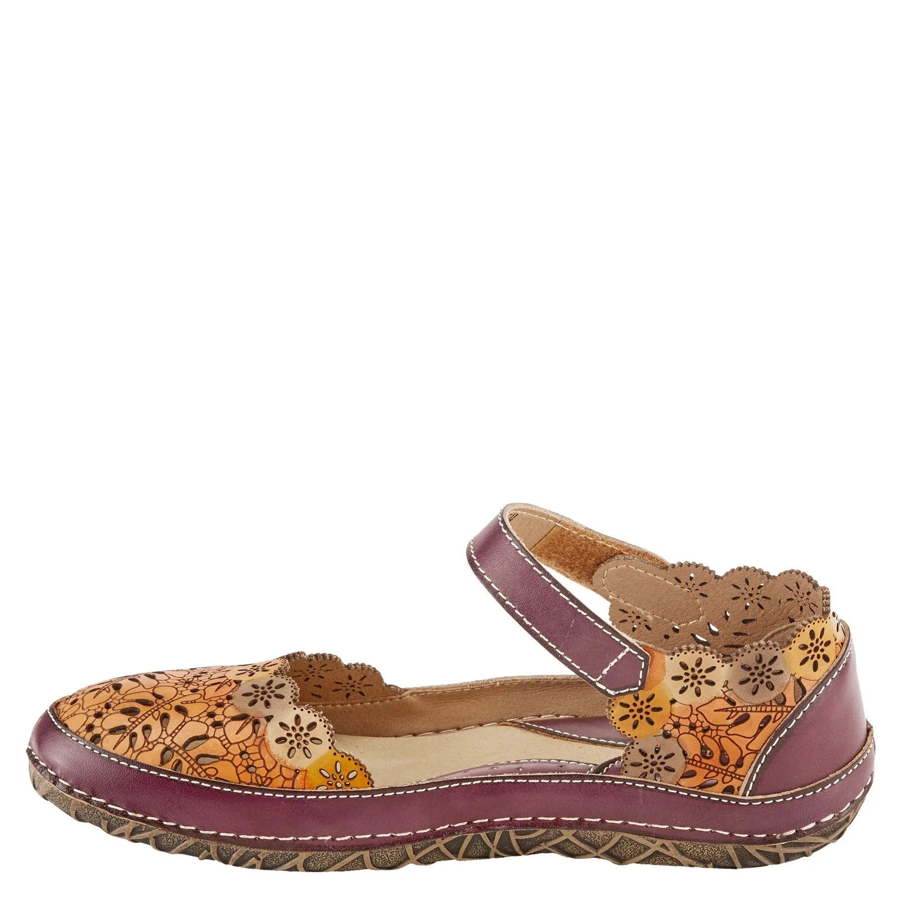 Parisian style to a classic Mary Jane shoe featuring hand painted laser floral cutouts and etching design, adjustable strap with hook and loop fastening and soft padded insole with arch support all on a flat textured comfort outsole.